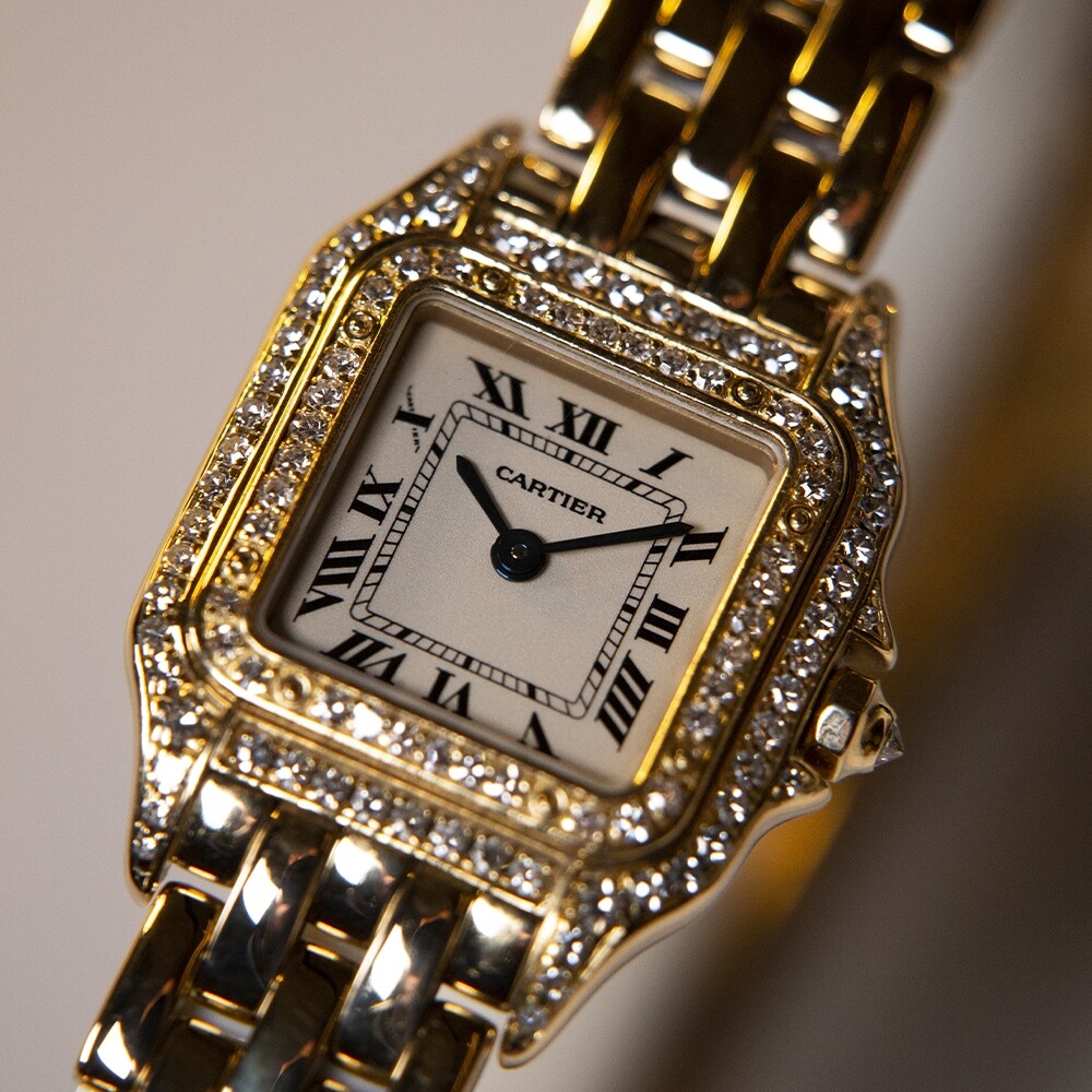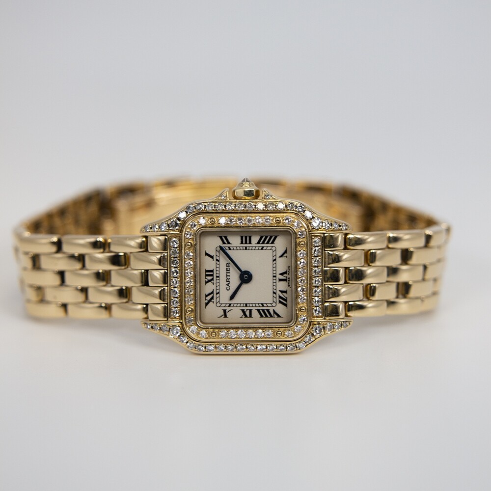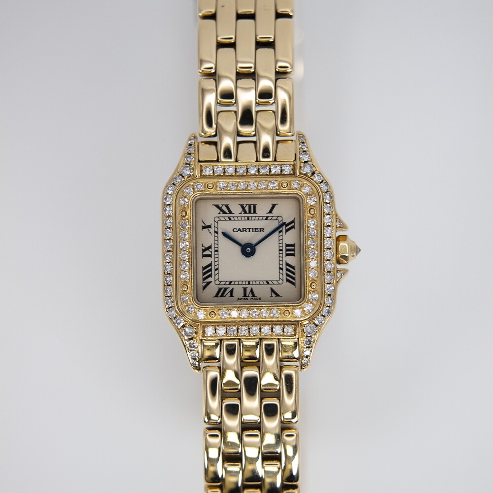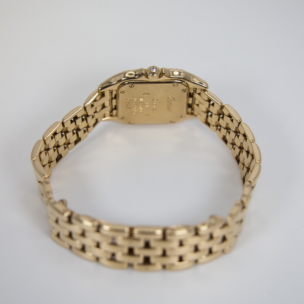 Cartier Panthère PM, référence WF3072B9 / 1280, « Figaro » avec un boîtier rectangulaire (22x30mm) en or 18 carats, serti de diamants, lunette et couronne serties, verre saphir. A l'intérieur se trouve un calibre Cartier 157 quartz, cadran grené argent avec index chiffres romains, aiguilles glaive bleui, bracelet en or jaune 18 carats.