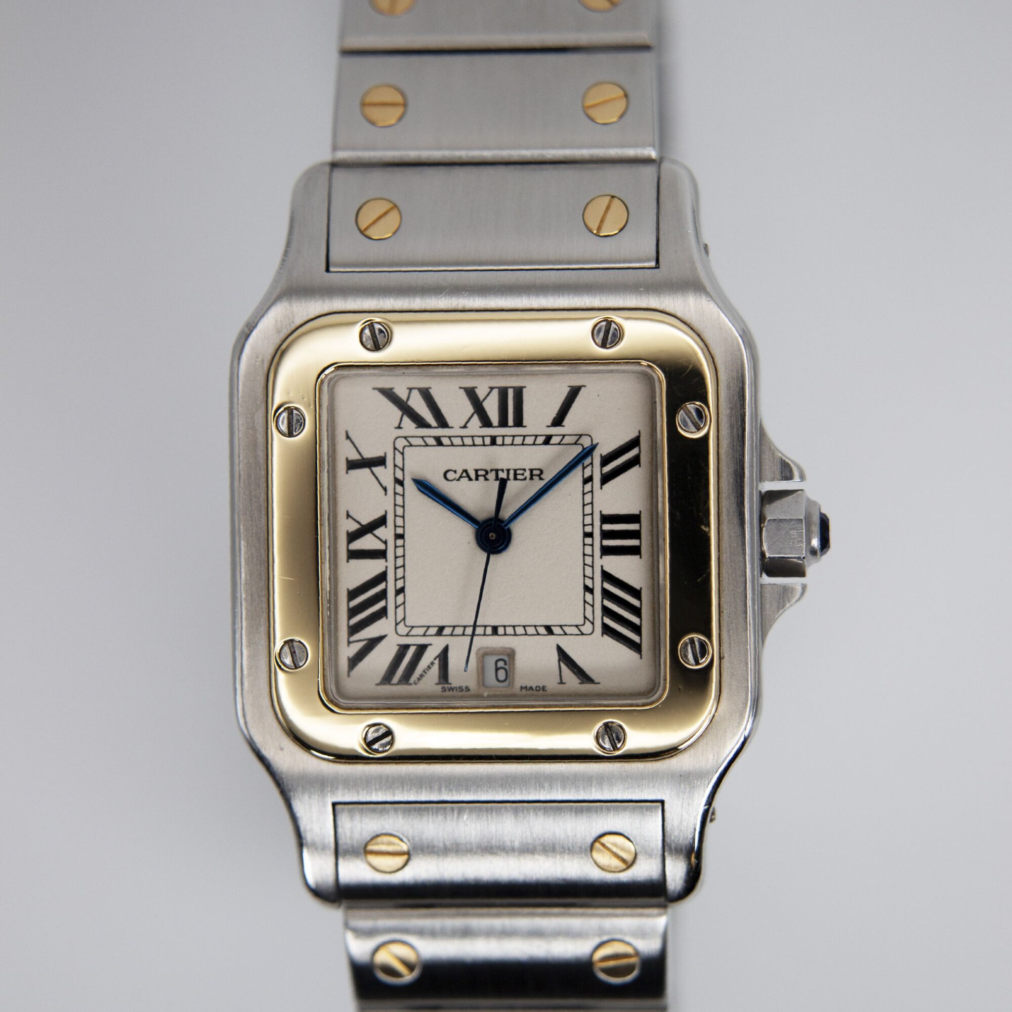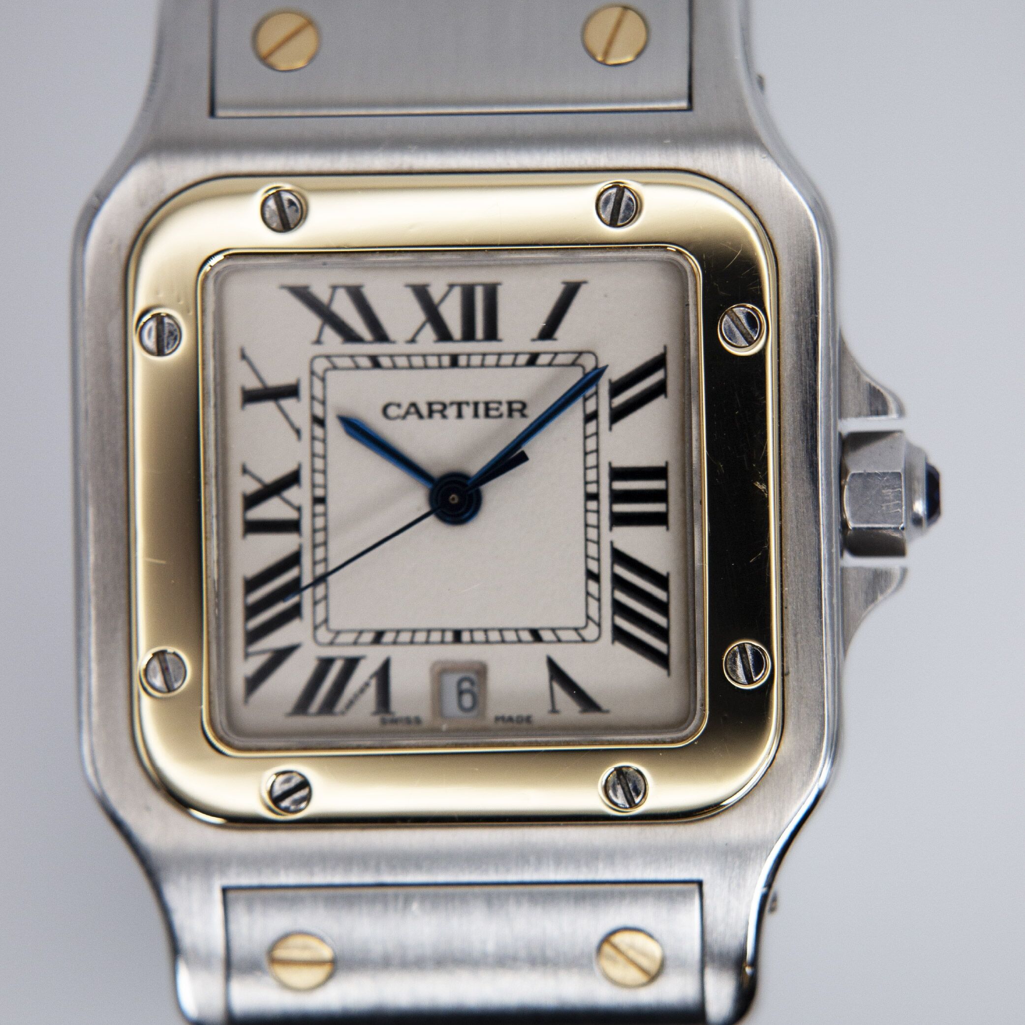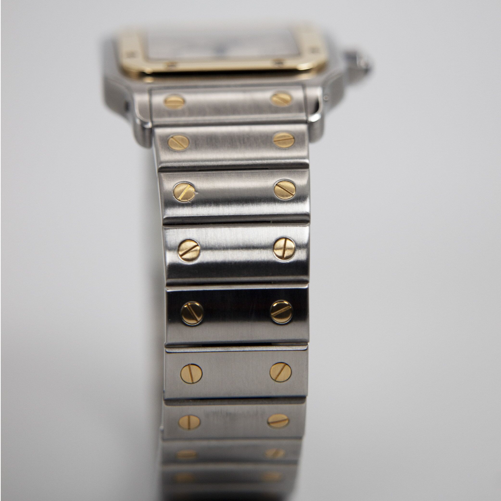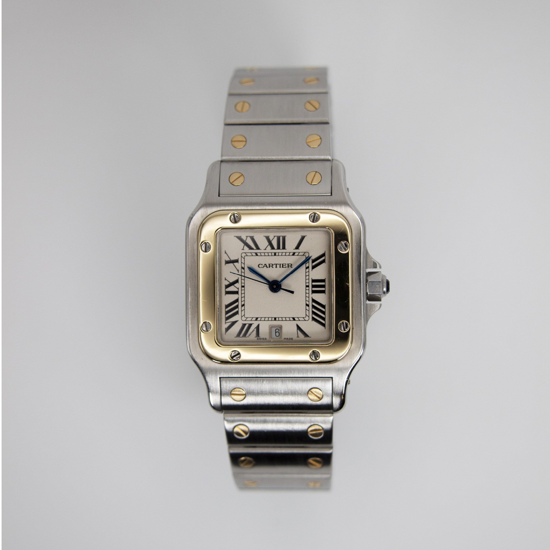 Cartier Santos Galbée GM, référence W20011C4 / 1566, avec un boîtier rectangulaire (29x41mm) en acier et or jaune, verre saphir. A l'intérieur se trouve un calibre Cartier à quartz, cadran blanc avec index chiffres romains, aiguilles en acier bleui, bracelet en acier et or jaune, avec une boucle déployante.