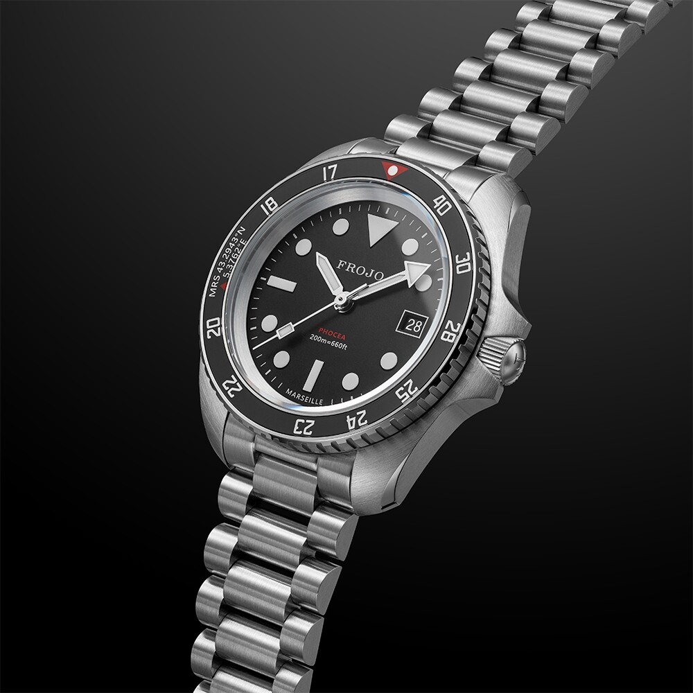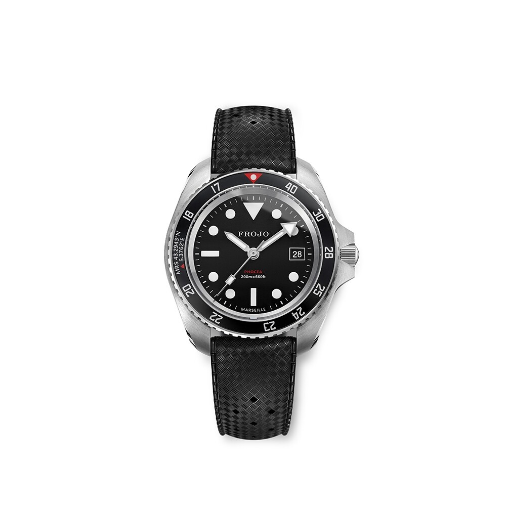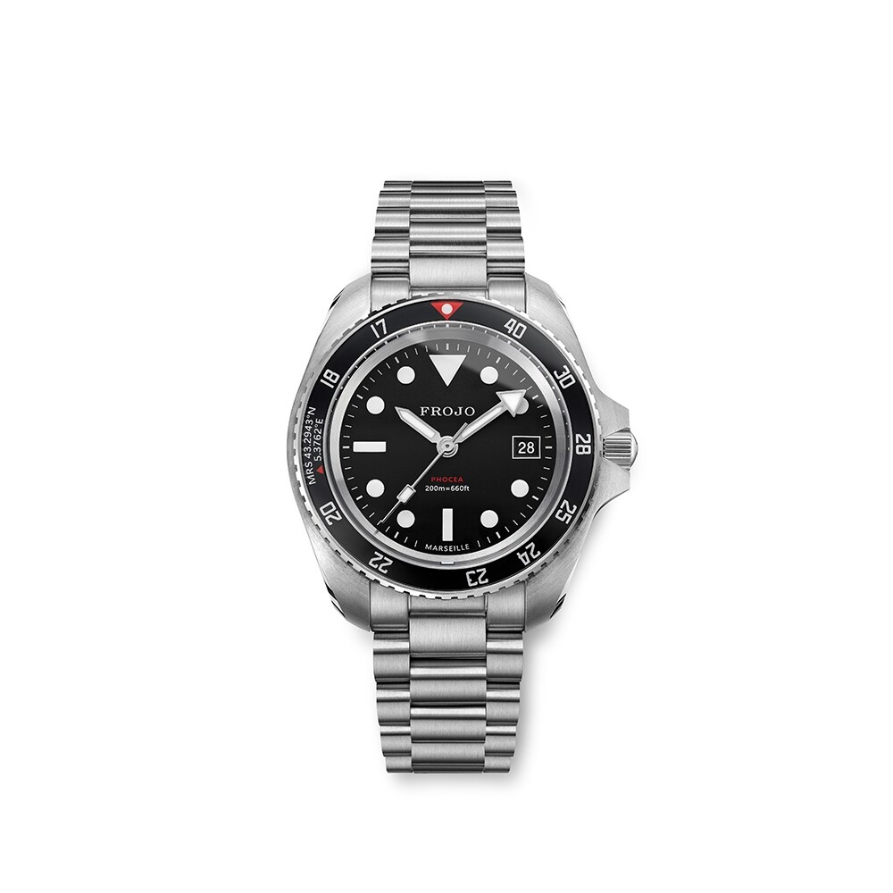 Montre Frojo PHOCEA ORIGINS, boîtier acier G.MONNIN 42mm, lunette saphir noire MN90, cadran noir maxi-dial, aiguilles et index Super-LumiNova blanc, mouvement automatique FRANCE EBAUCHES, bracelet acier satiné 3 maillons + un bracelet caoutchouc tropic.