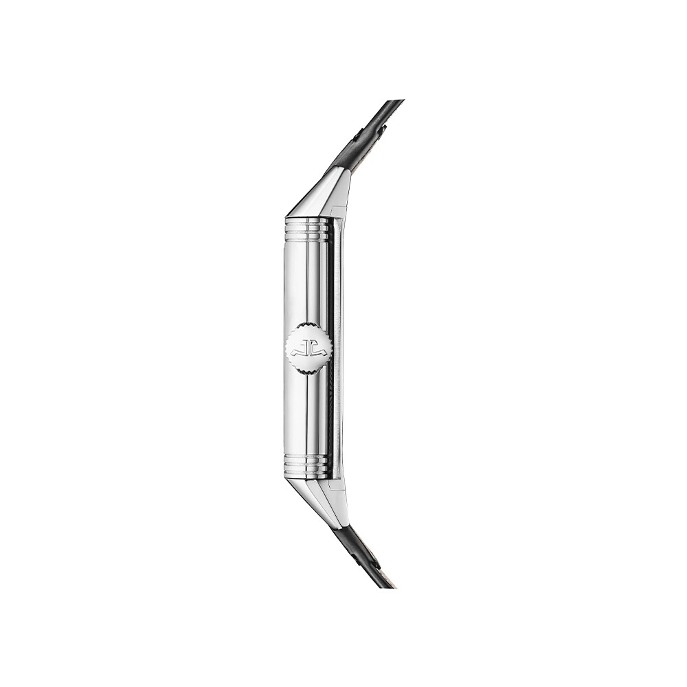 Dans son boîtier en acier de 8,51 mm, la Reverso Tribute Small Seconds met le temps réversible à l’honneur. Équipée du Calibre Manufacture 822 à remontage manuel dont chaque composant est décoré avec soin, elle arbore à 6h une petite seconde qui témoigne de l’ingéniosité mécanique qu’elle renferme. Sur le cadran opalin, les godrons aux lignes pures, le chemin de fer, les index en applique et les aiguilles Dauphine d’un noir profond rappellent les codes esthétiques d’inspiration Art déco des premières Reverso de 1931. Ce modèle au verso personnalisable est proposé avec un bracelet noir bi-matières (cuir/tissu) au design Casa Fagliano.