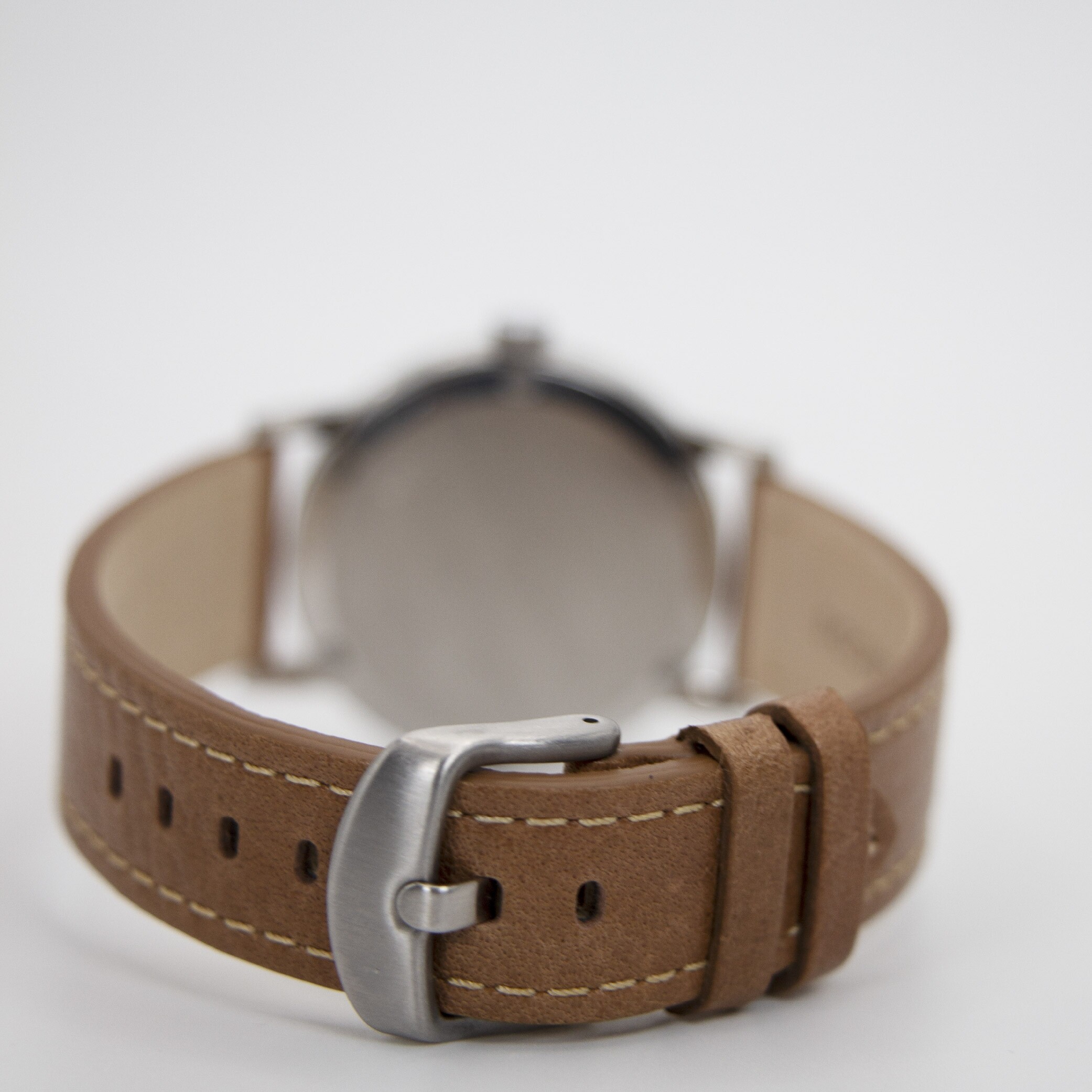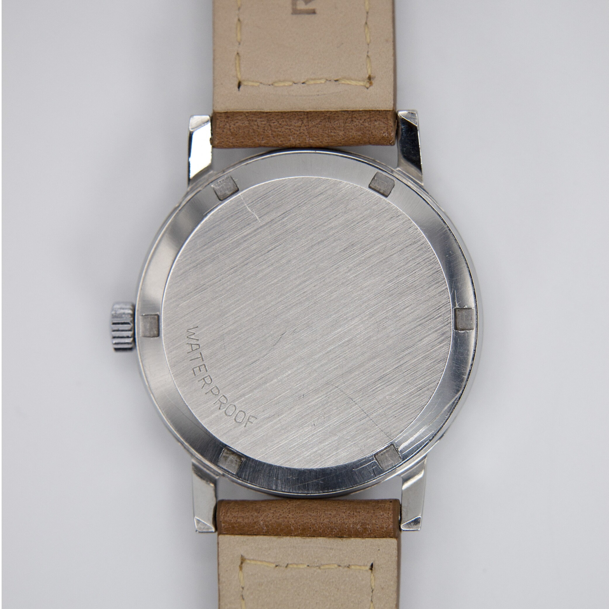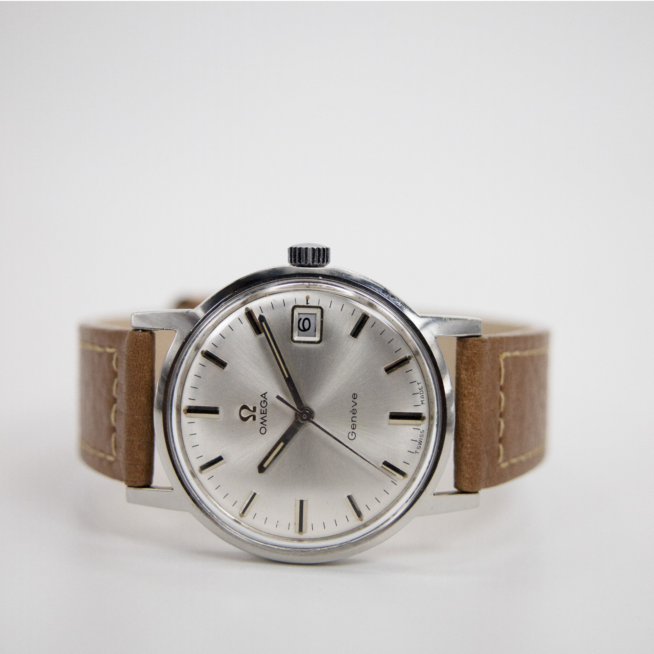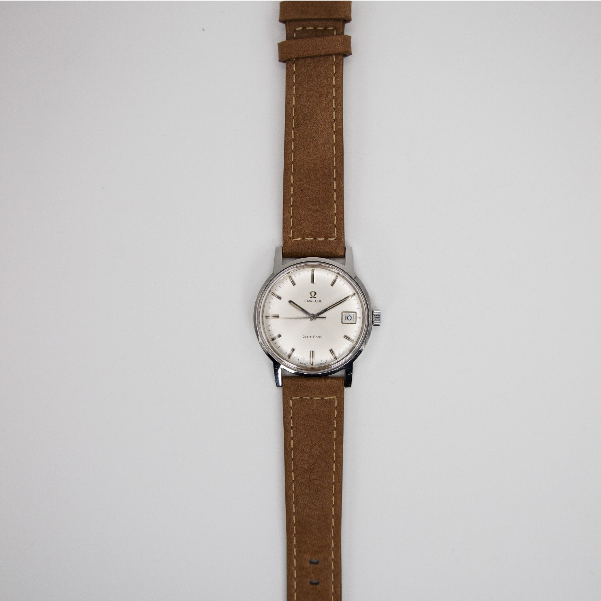 Omega Genève, référence 136.070, avec un boîtier rond (35 mm) en acier, verre plexiglass. A l'intérieur se trouve un calibre 613, mécanique à remontage manuel, , cadran argent avec index bâtons, bracelet en cuir avec une boucle ardillon en acier.
