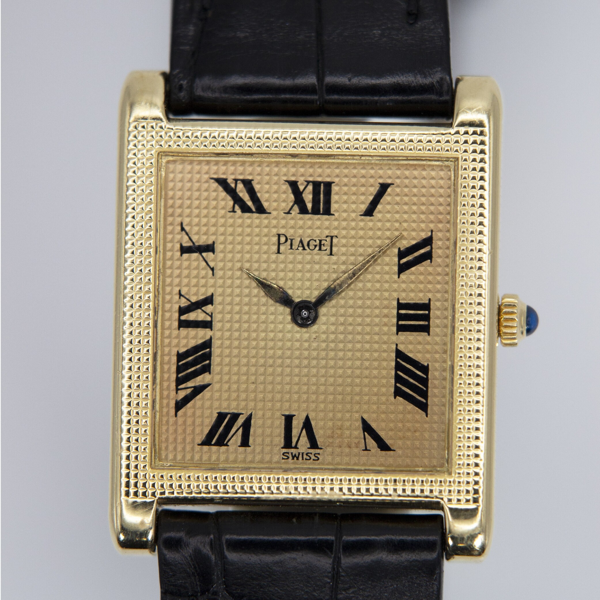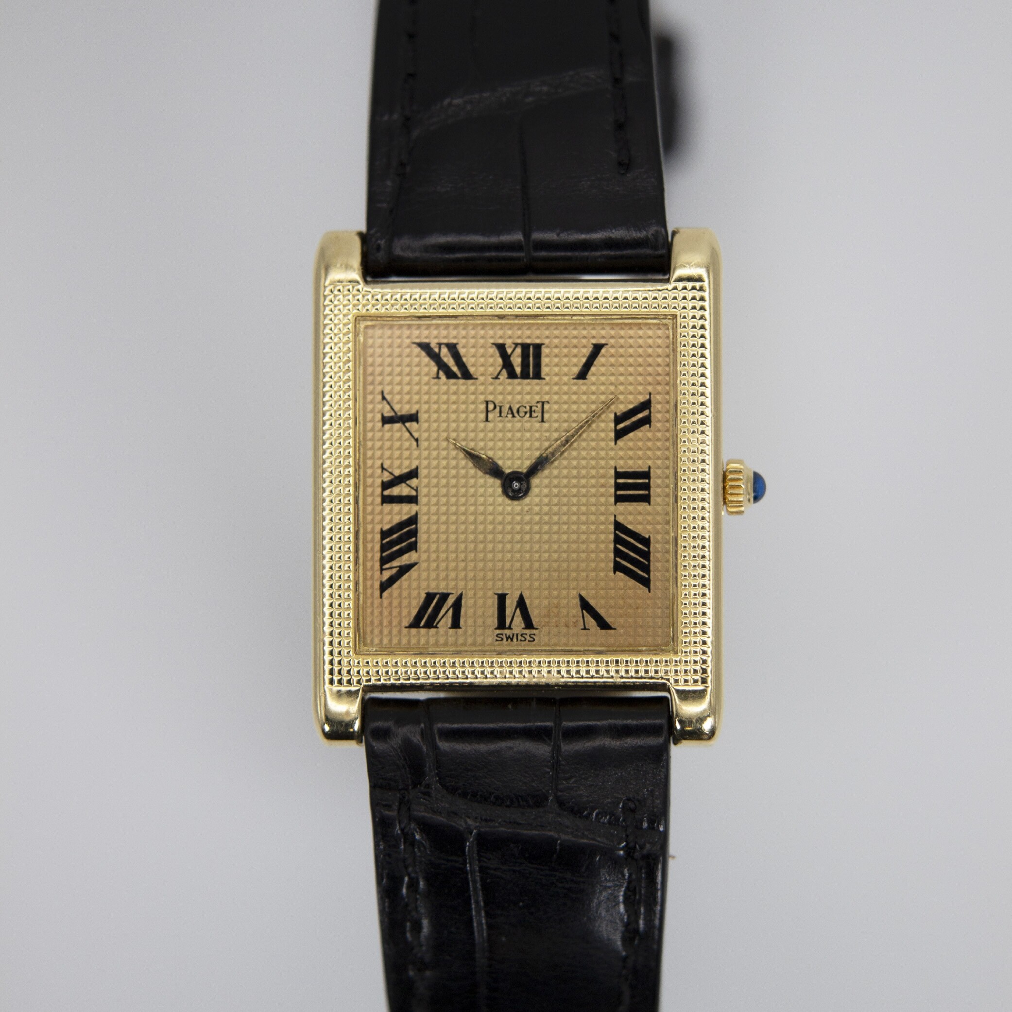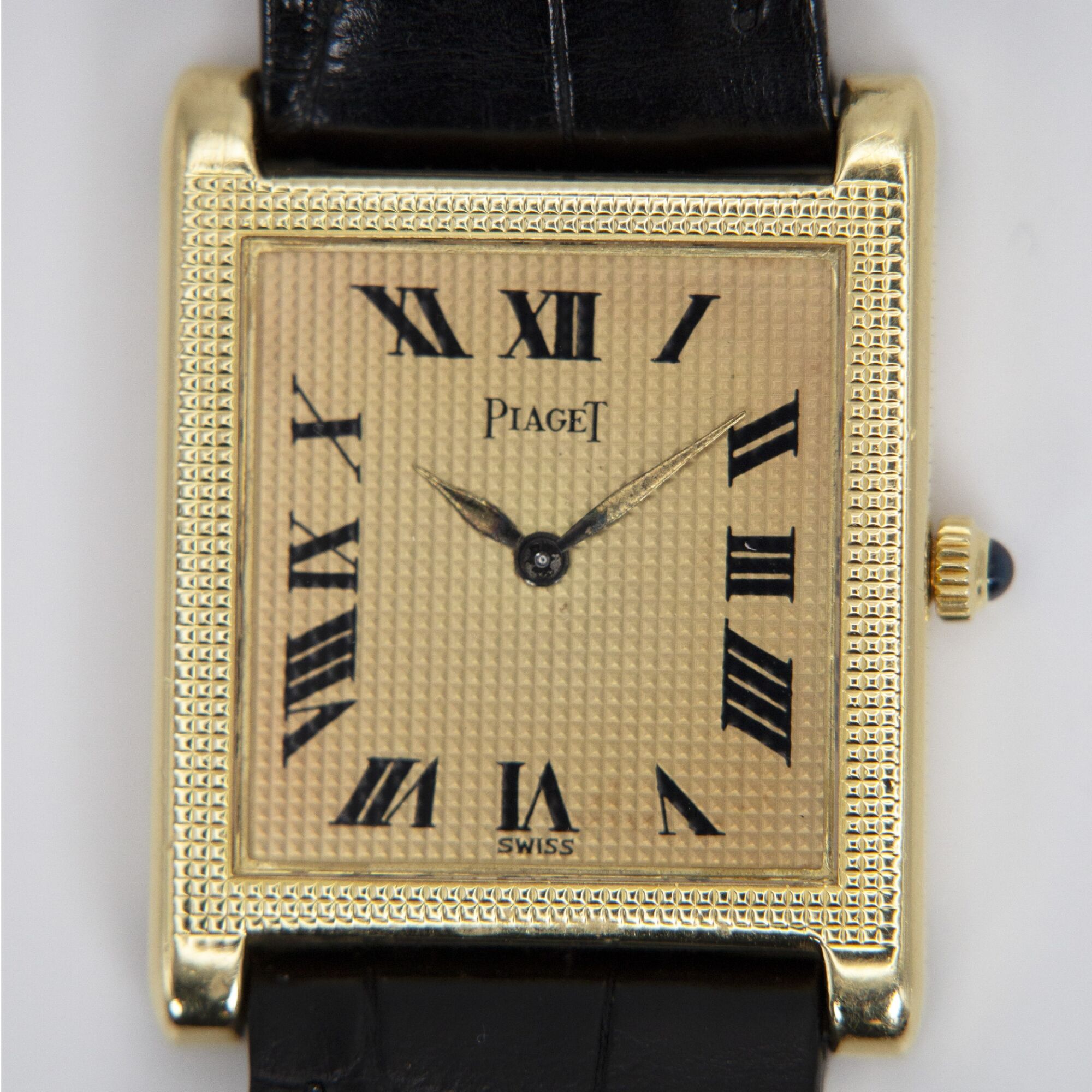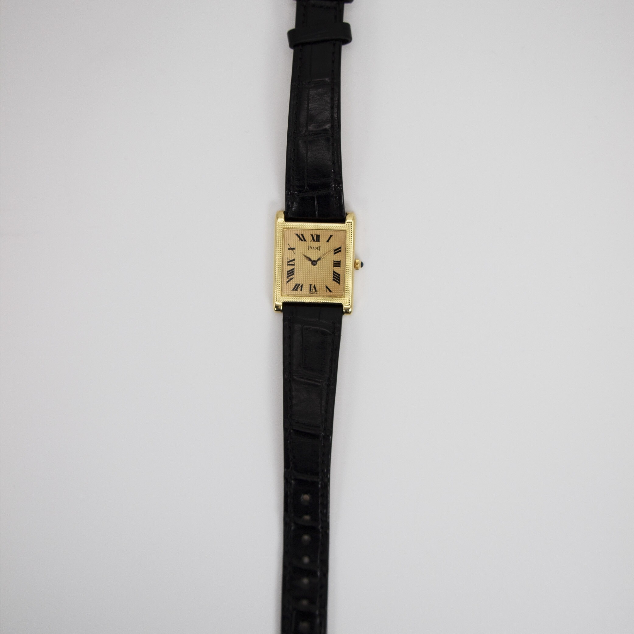 Montre Piaget "Clous de Paris", référence 931, avec boîtier rectangulaire (23x29mm) en or jaune, verre minéral. À l'intérieur se trouve un mouvement mécanique à remontage manuel, Calibre Piaget 9p, cadran doré finition clous de Paris avec index chiffres romains. Bracelet en alligator noir avec un boucle ardillon en or 18 carats Piaget.