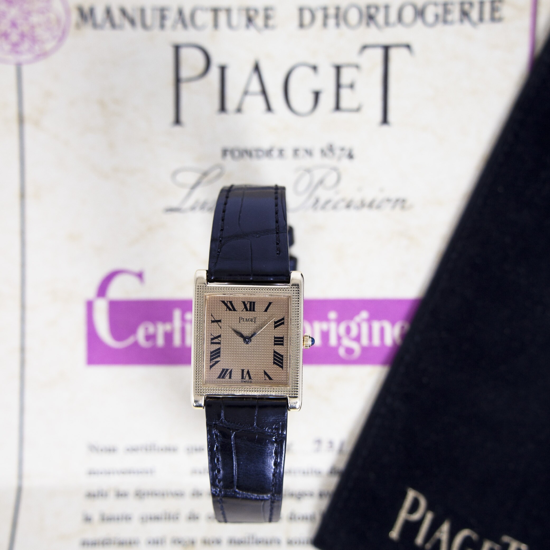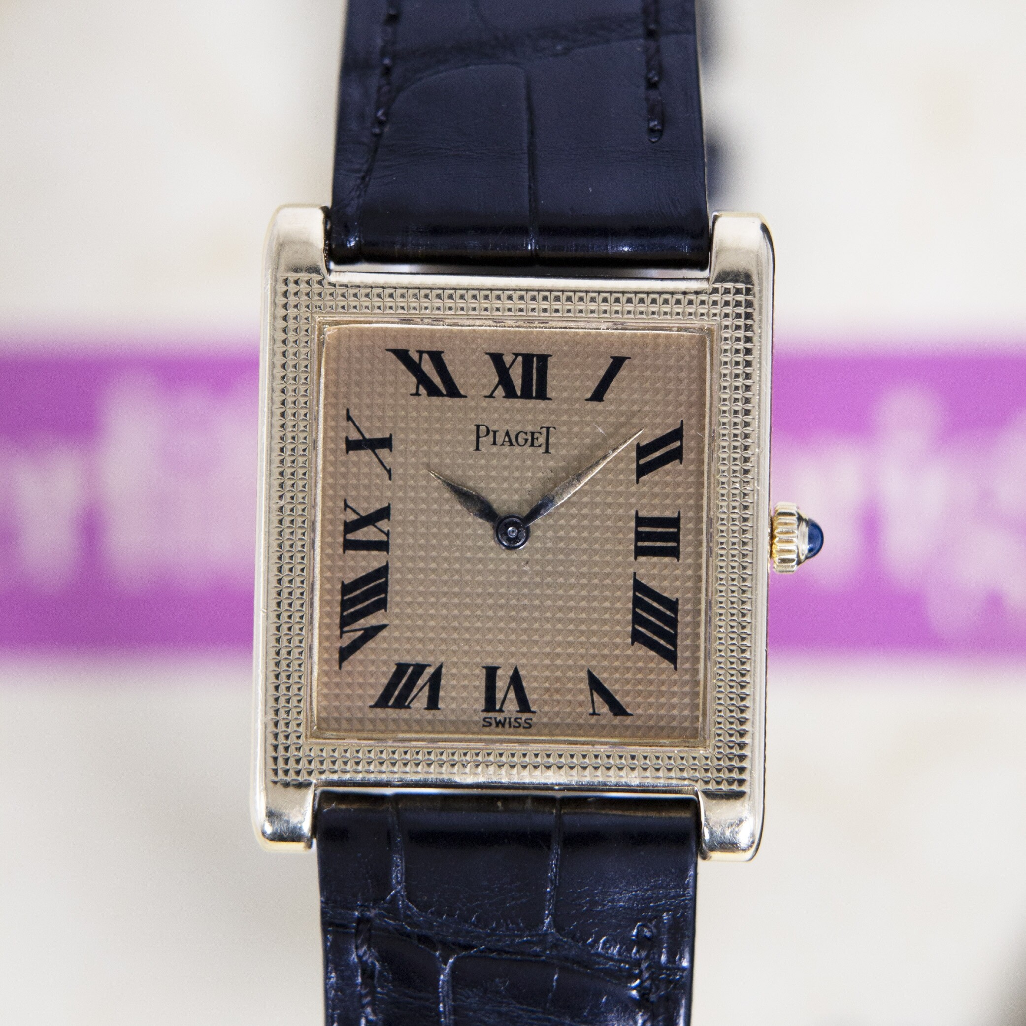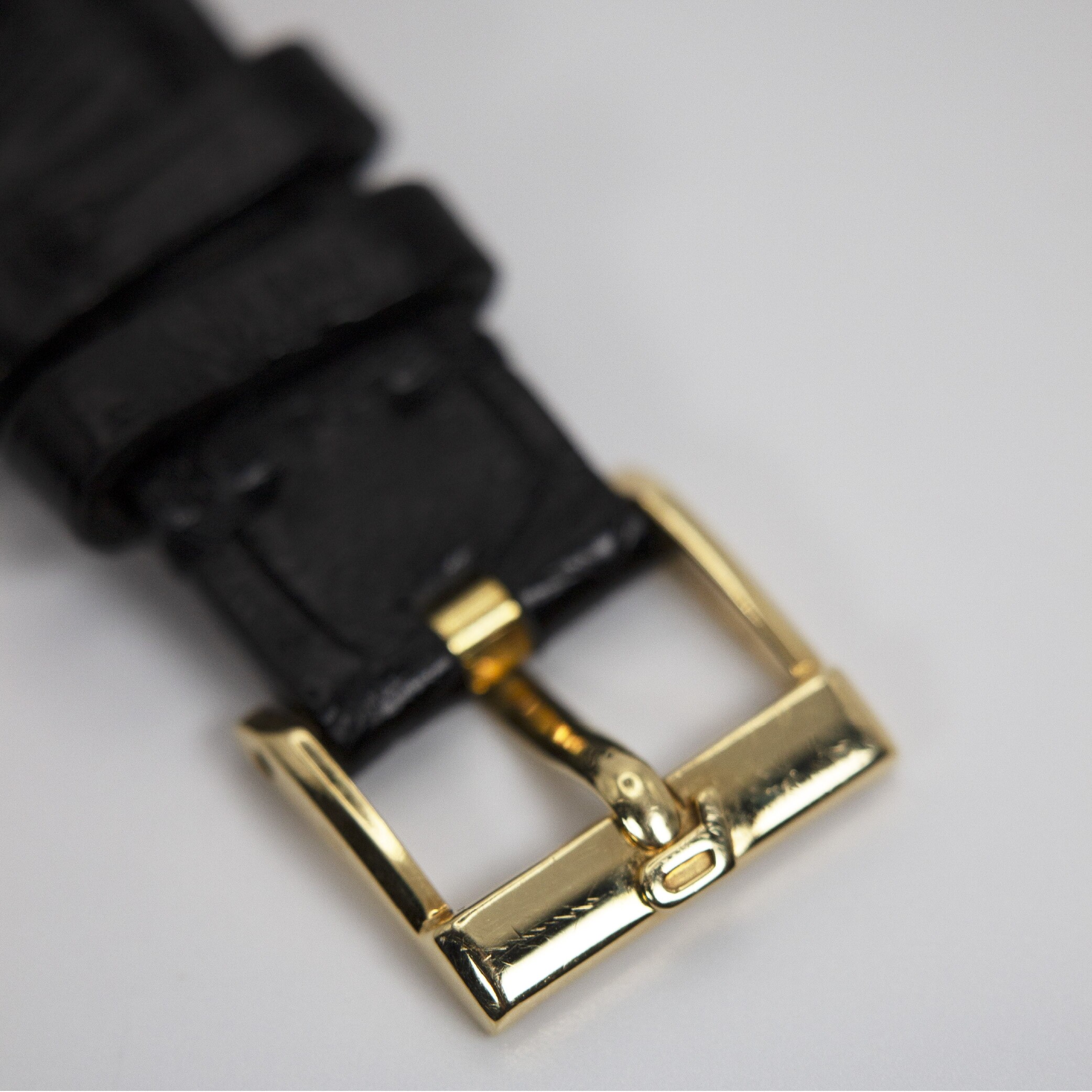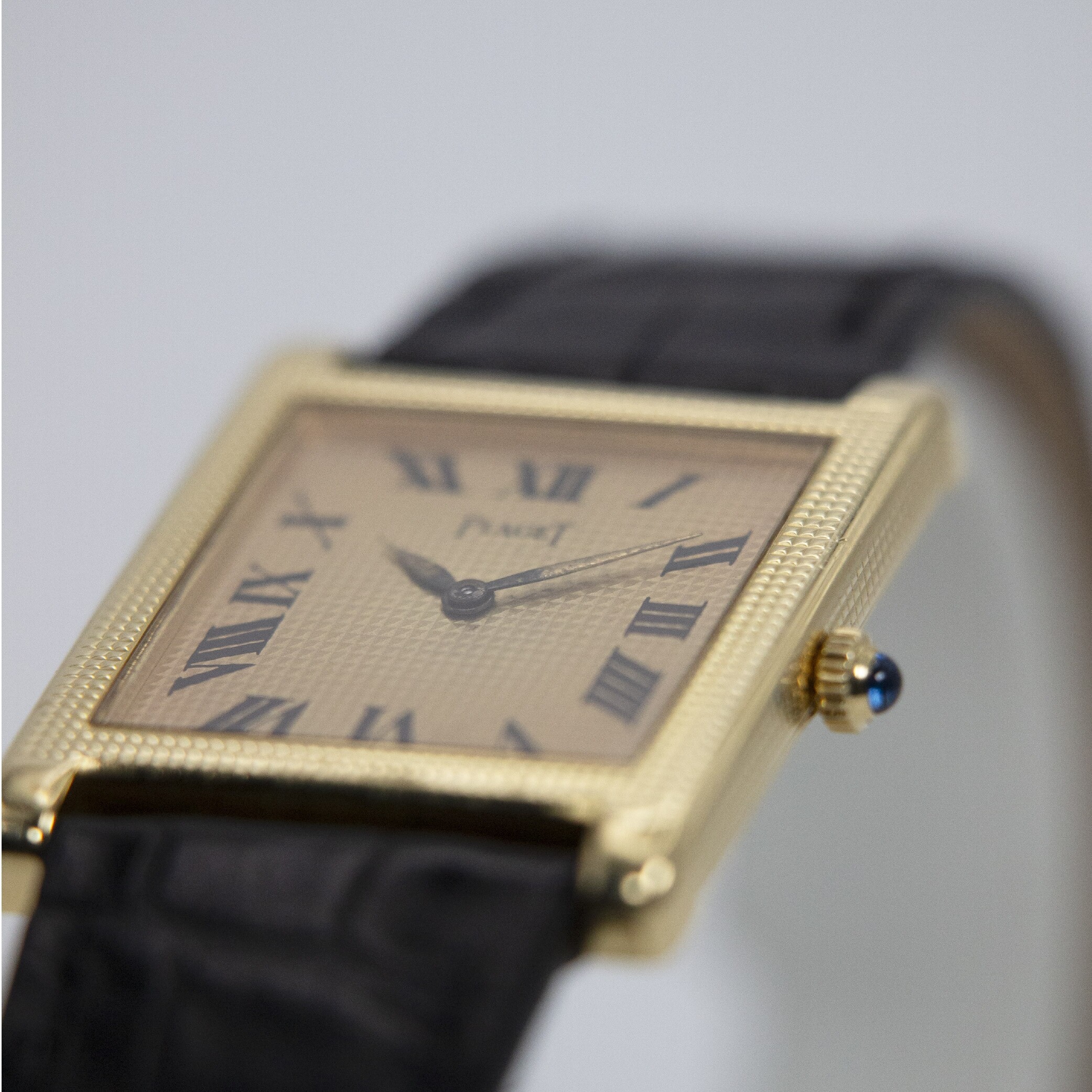 Montre Piaget "Clous de Paris", référence 931, avec boîtier rectangulaire (23x29mm) en or jaune, verre minéral. À l'intérieur se trouve un mouvement mécanique à remontage manuel, Calibre Piaget 9p, cadran doré finition clous de Paris avec index chiffres romains. Bracelet en alligator noir avec un boucle ardillon en or 18 carats Piaget.